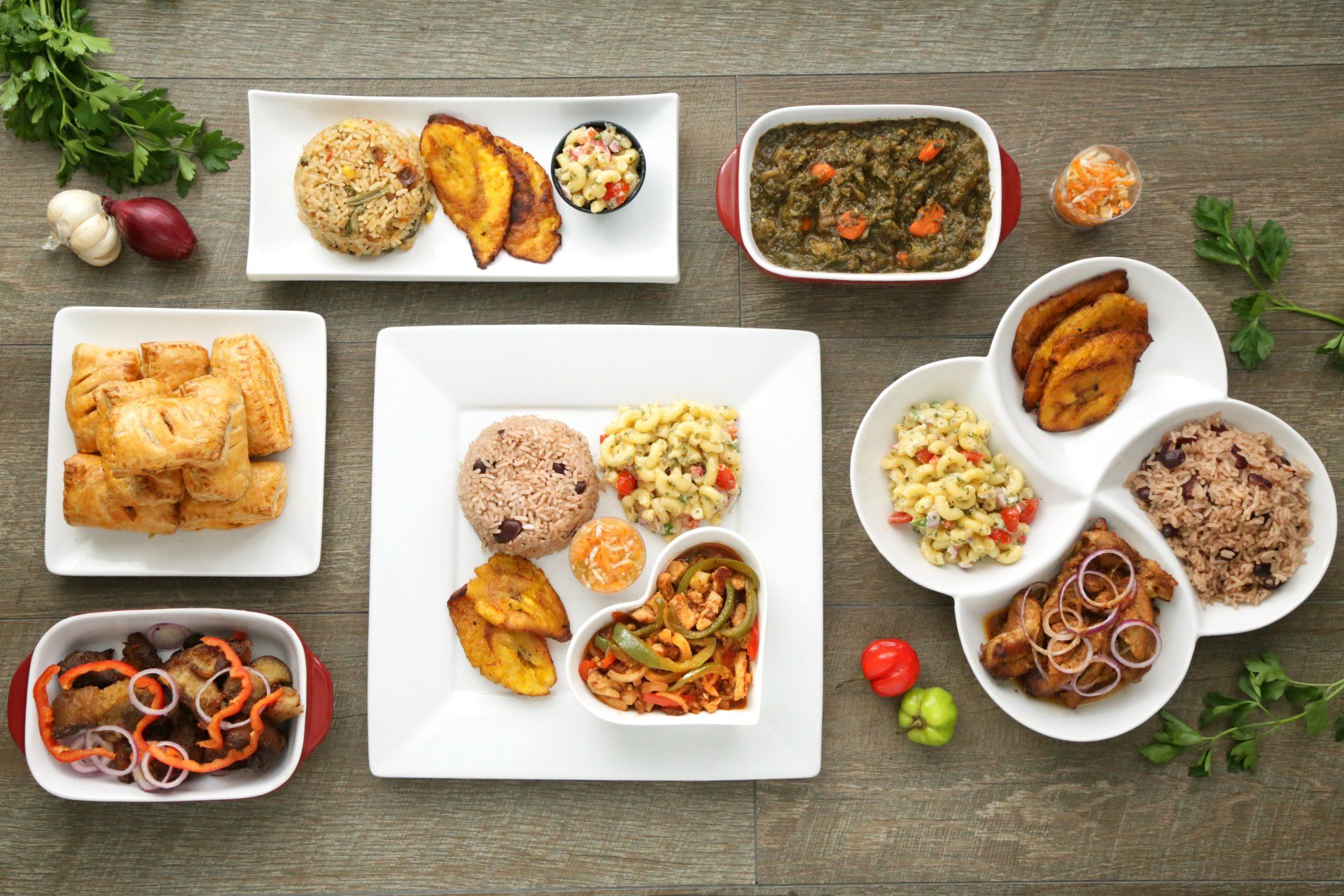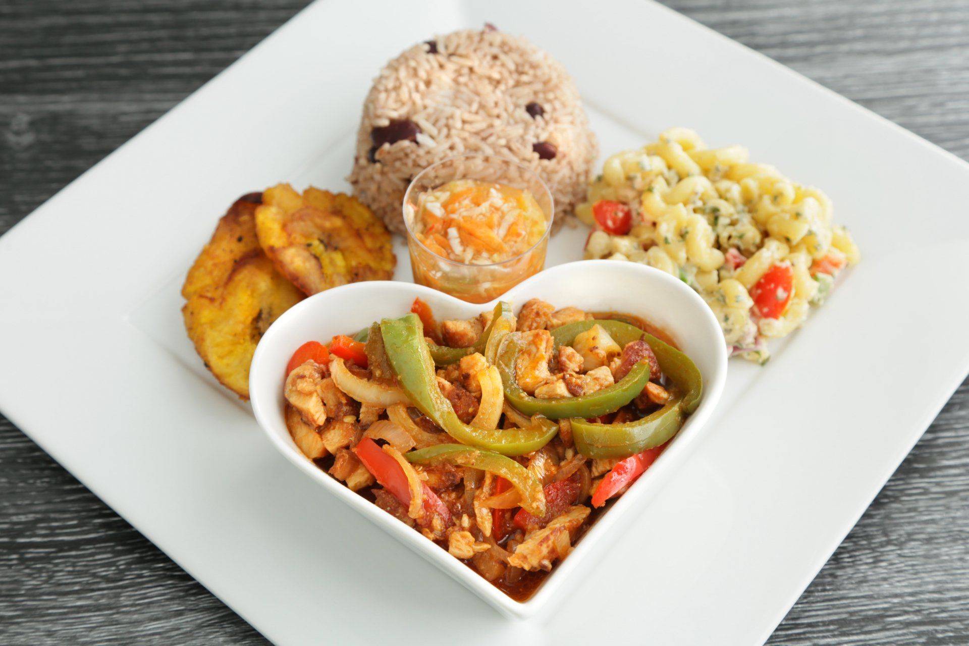 Macaroni Gratiné, Riz collé aux haricots rouges, Bananes Plantains Frites, Salade, Sauce Créole, Pikliz et Dessert.