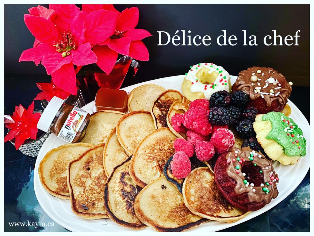 Mini gâteau au beurre, beignets aux bananes servi avec baies et sirop aromatisé à la grenadine