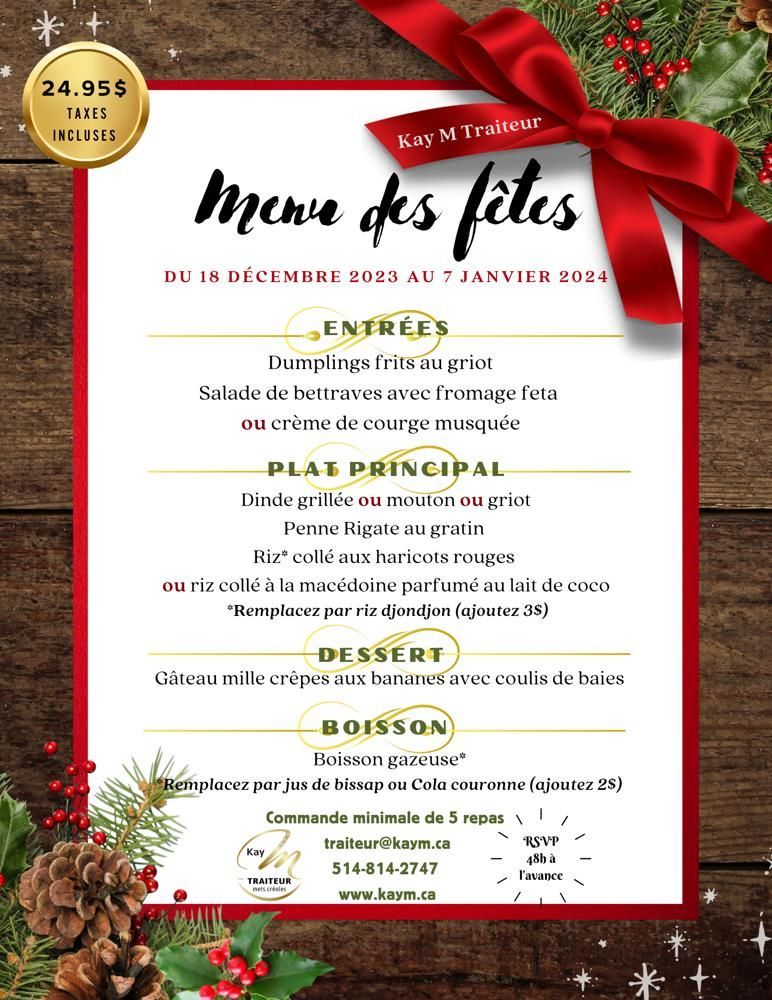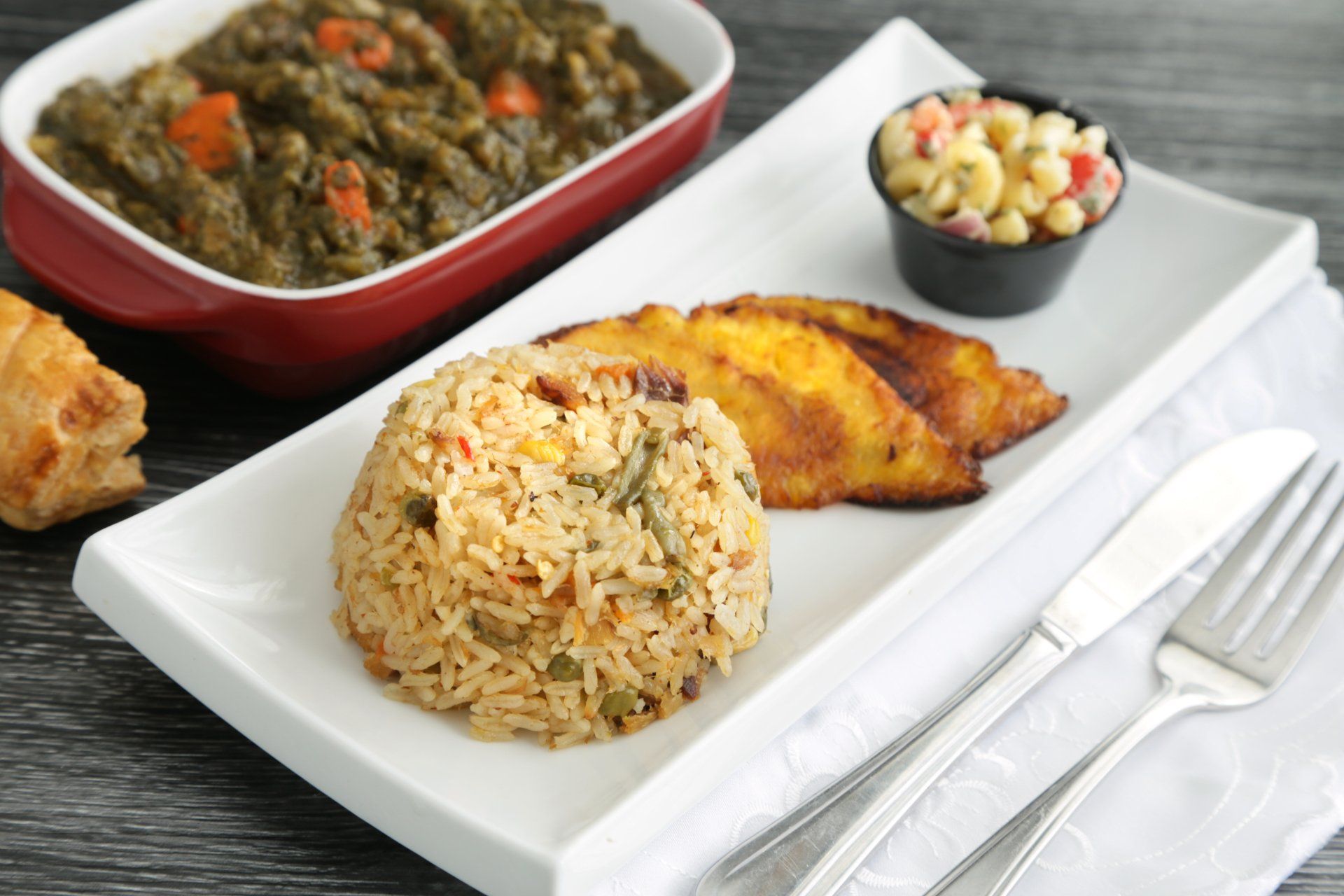 Macaroni Gratiné, Riz collé aux haricots rouges, Bananes Plantains Frites, Salade, Sauce Créole, Pikliz et Dessert.